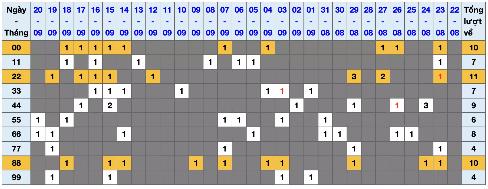 Dưới đây là bảng thống kê các cặp số tiềm năng dựa trên tần suất xuất hiện và khả năng về trong ngày. Dữ liệu này được cập nhật liên tục và cung cấp cái nhìn tổng quan về các “cầu” đang chạy.